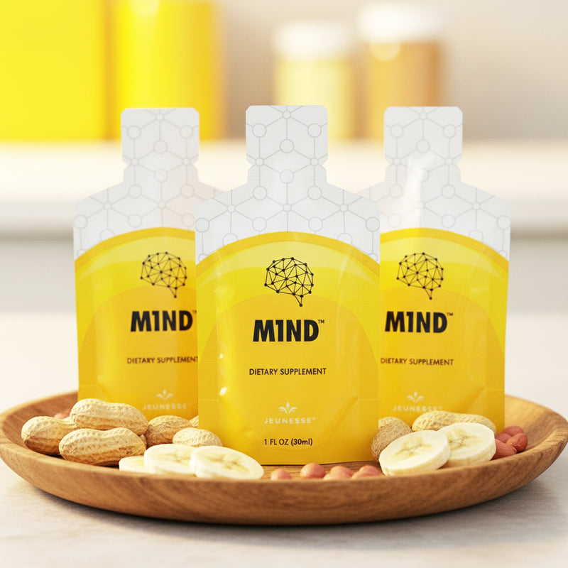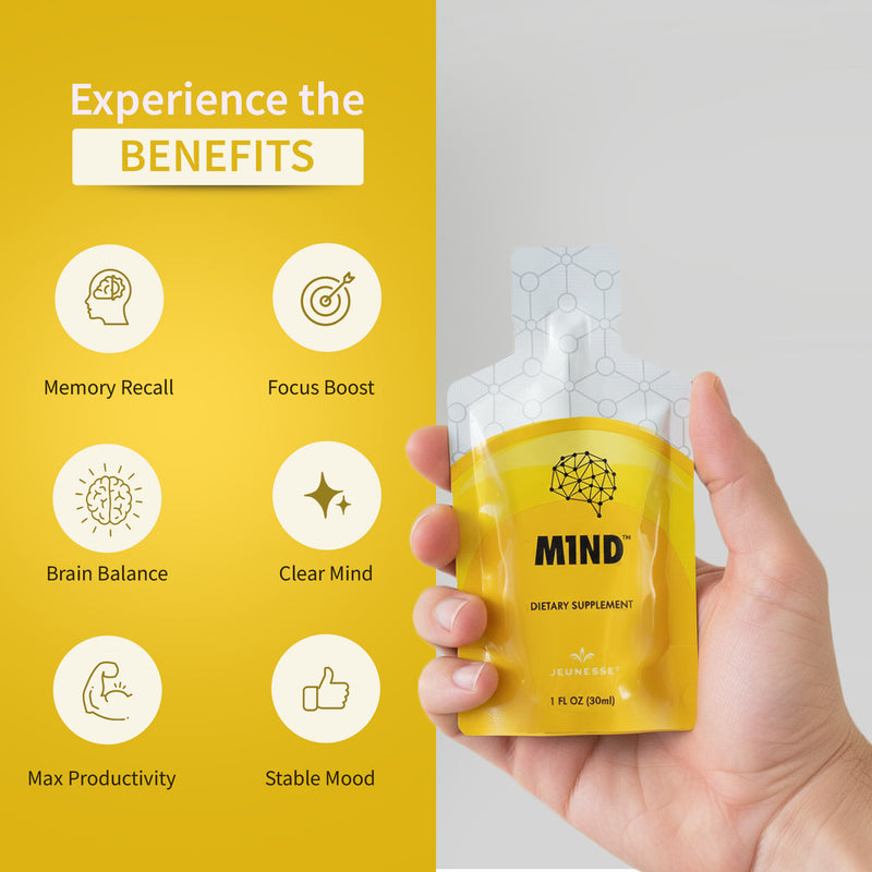 صُمم منتج Jeunesse M1ND® لمساعدتك على الحفاظ على تركيزك ونشاطك الذهني بشكل طبيعي. فهو مدعم بمحلل بروتين الحرير CERA-Q™، وحمض غاما أمينوبوتيريك (GABA) ، و L-ثيانين ، وألفا جي بي سي ، مما يوفر لك دفعة معرفية دون الكافيين أو المنشطات الصناعية.