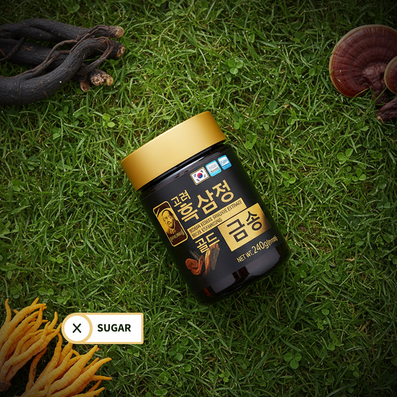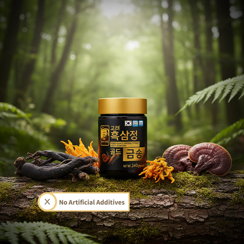 مستخلص الجينسنغ الأسود الكوري، مستخلص الكورديسيبس ميليتاريس، مستخلص فطر الريشي، الجينسنغ الأحمر المخمر (اختياري)، مستخلص جذر عرق السوس، مسحوق جذر الزنجبيل، قاعدة العسل (أثر)، الماء النقي (لتعليق المعجون)، حاملات المستخلص الطبيعية (مستندة إلى النباتات)، حمض الستريك غير المعدل وراثيًا (مثبت).